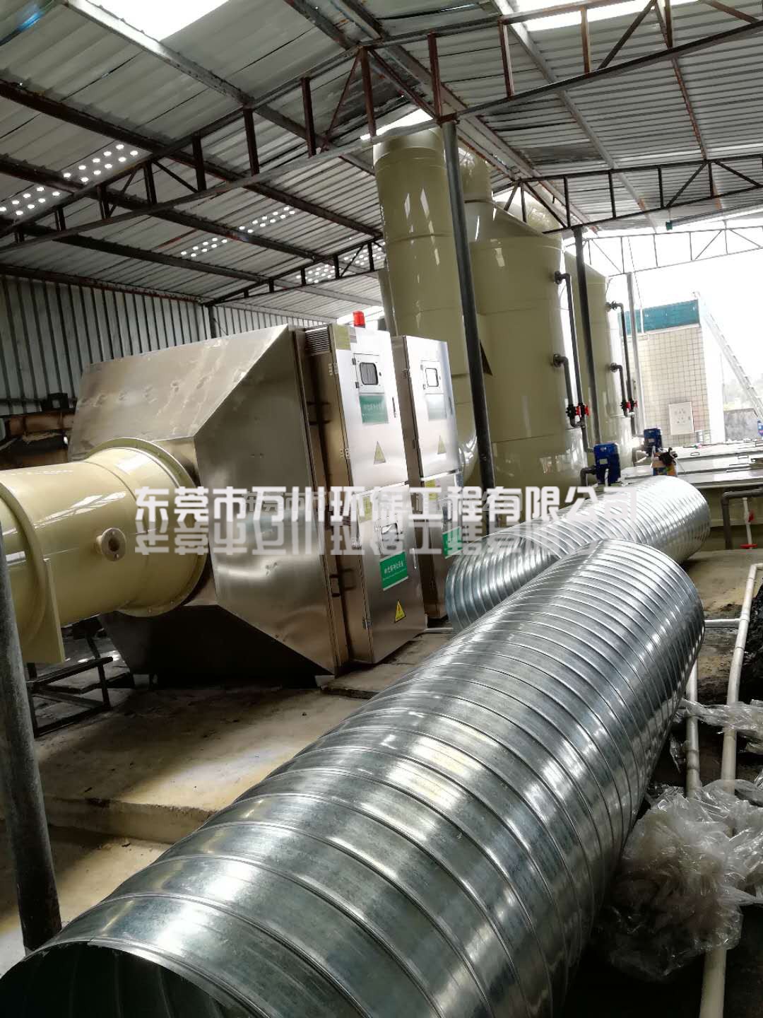 德賽公司在零件生產(chǎn)加工的時候會使用到噴漆工藝,使用噴漆工藝就會產(chǎn)生噴漆廢氣,其主要成分為粉塵和有機廢氣,根據(jù)德賽公司的實際情況,我們工程師使用了”噴淋塔+UV光解凈化器+等離子凈化器“這套方案去處理噴漆廢氣。